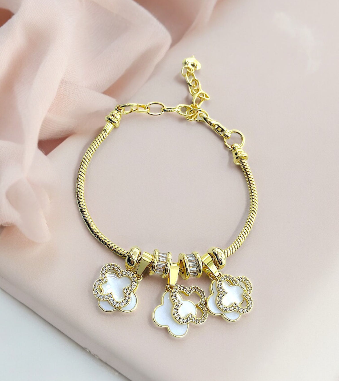 14k gold plates pandora bracelet. Clover are white.