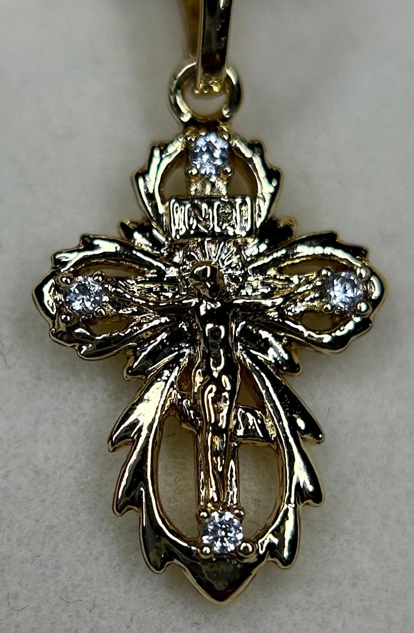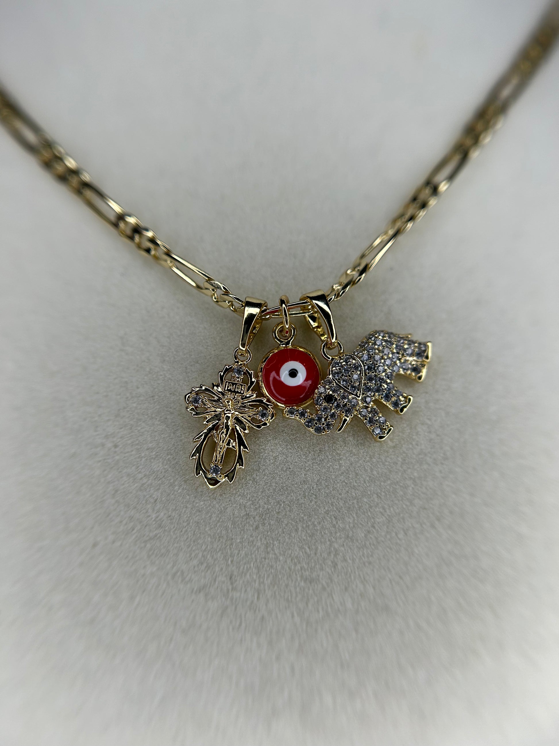 Three small Pendants cross, red eye and small shiny elephant. 14k gold plated