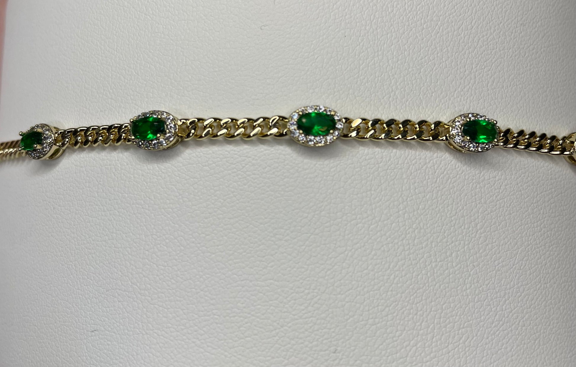 14k gold plated with green stones. 7 inch with extension