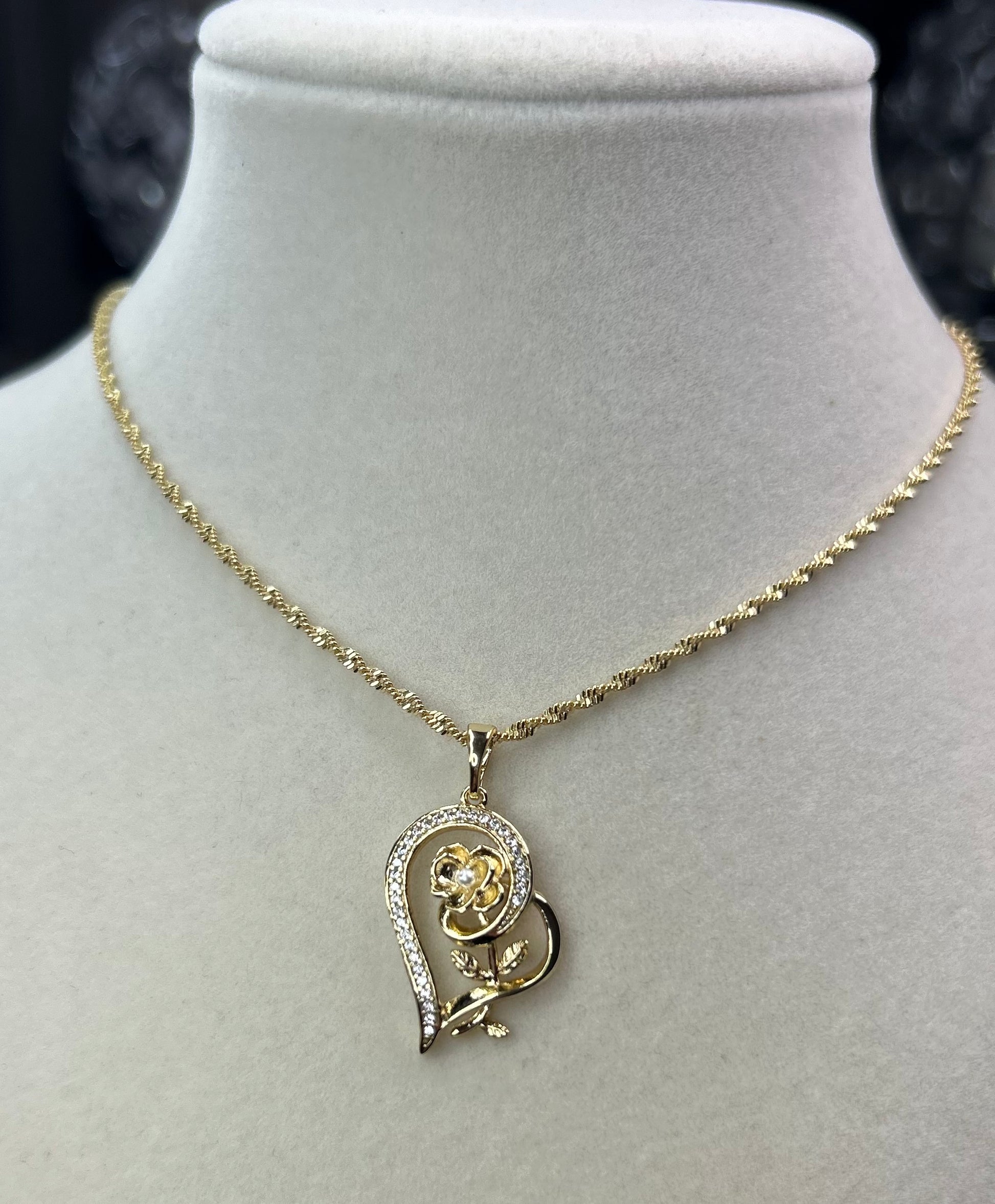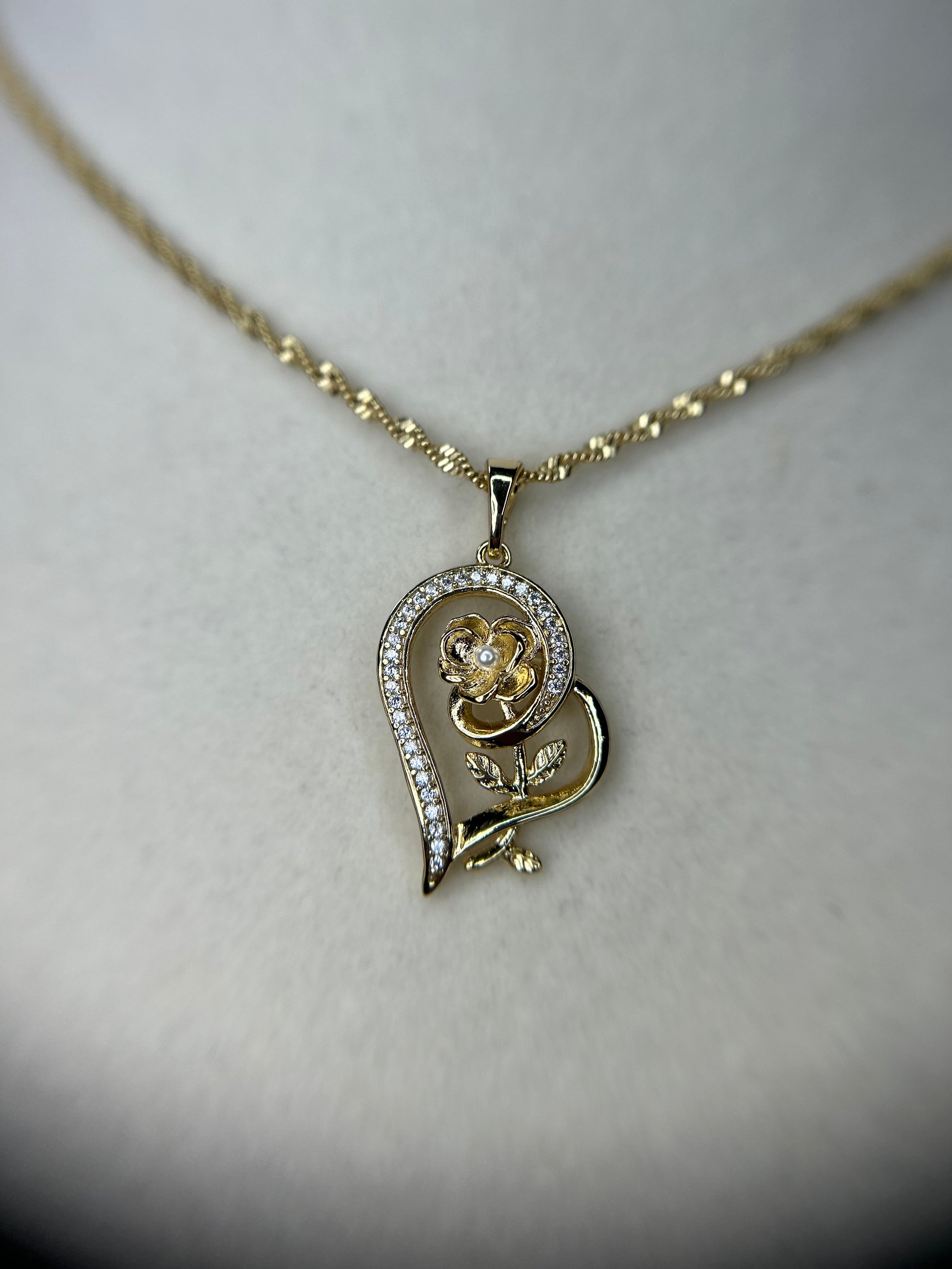14k gold plated pendant with rose and small pearl in rose. 18inch necklace 14k gold plated.