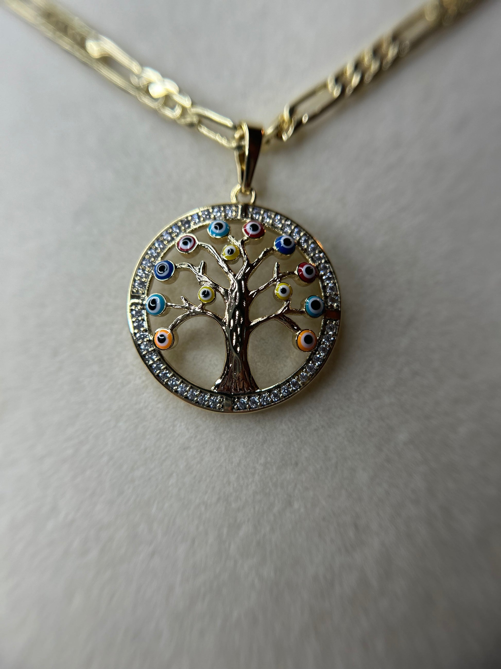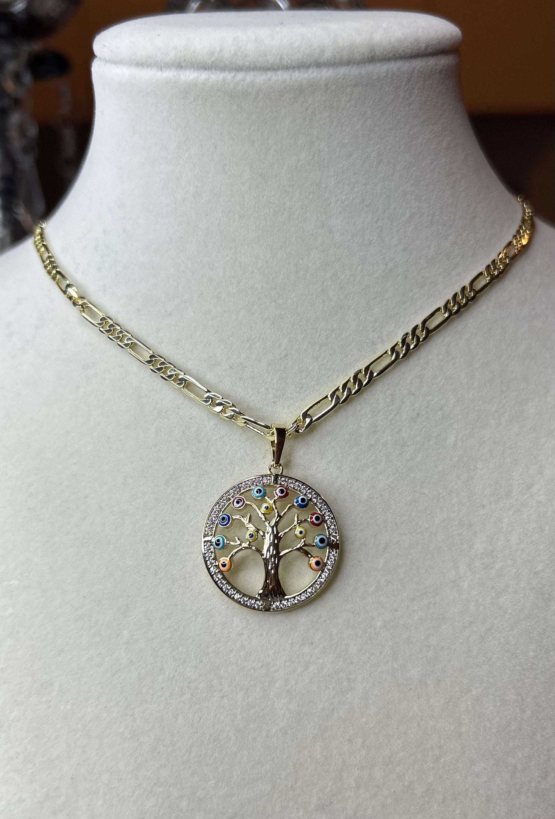 14k gold plated with tree of life pendant that has multicolored eyes.